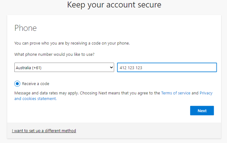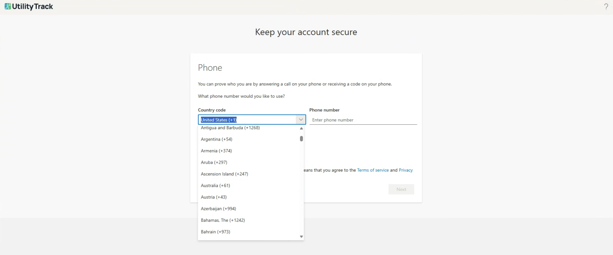 Now we go through the process of setting up 2 Factor Authentication. Select the country and area code you're calling from, then proceed to enter a phone number you wish to receive the security code to.