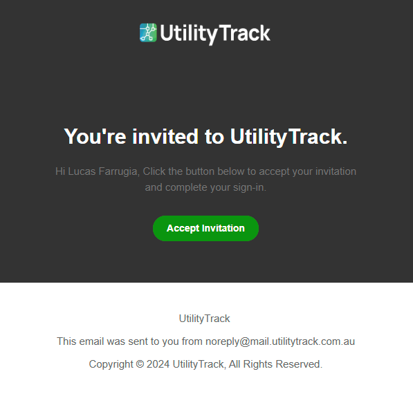 A team member will send you an invitation which will be delivered from noreply@mail.utilitytrack.com.au, see below: